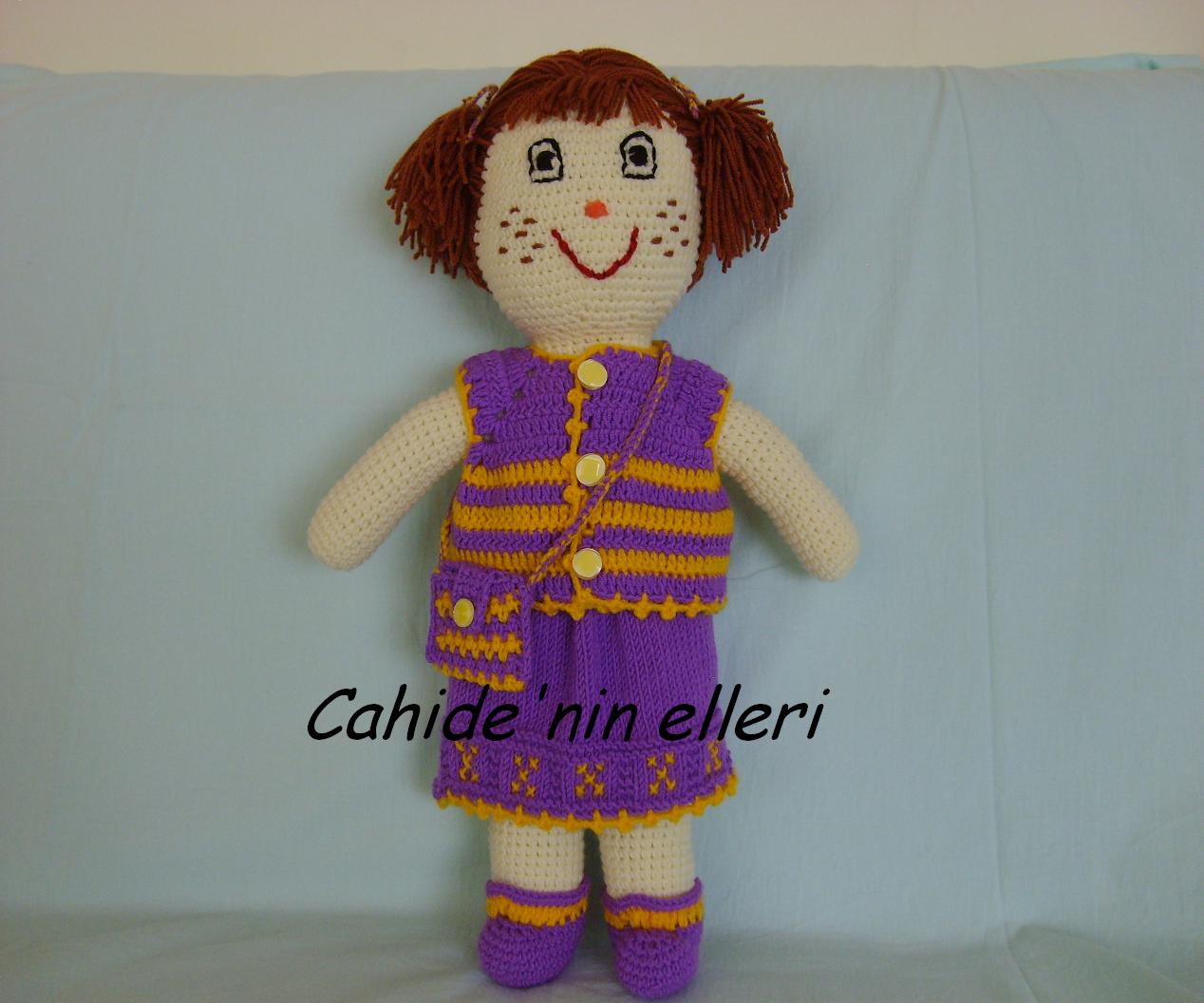 Bebeğin belli sayıları yok,kafasından başladım,artırarak çay tabağı büyüklüğüne getirdim.Artırmayı bırakıp çene kısmına kadar düz ördüm.daralta daralta boynu oluşturdum.boynun iki yanından üçer üçer altı sıra artırdım.Ve yine artırmayı kesip beline kadar düz ördüm.bel kısmını ikiye ayırıp buradan bacakları ördüm.içini doldurup patikleri ördümve bacakların açık kısmına kapatıp diktim.Bu arada patiklerin ön kısmınıda doldurdum.daha sonra kolları örüp diktim.Kıyafetinin eteğini şişle,yeleğini tığla ördüm.saçlarını ise hiç sormayın tek tek tığla alıp düğümledim bu iş tam bir günümü aldı.dilim döndüğünce anlattım.yinede takıldığınız bir yer olursa sorabilirsiniz.