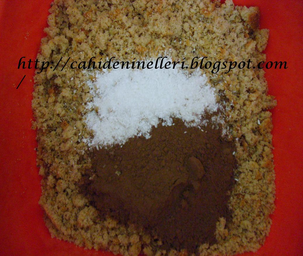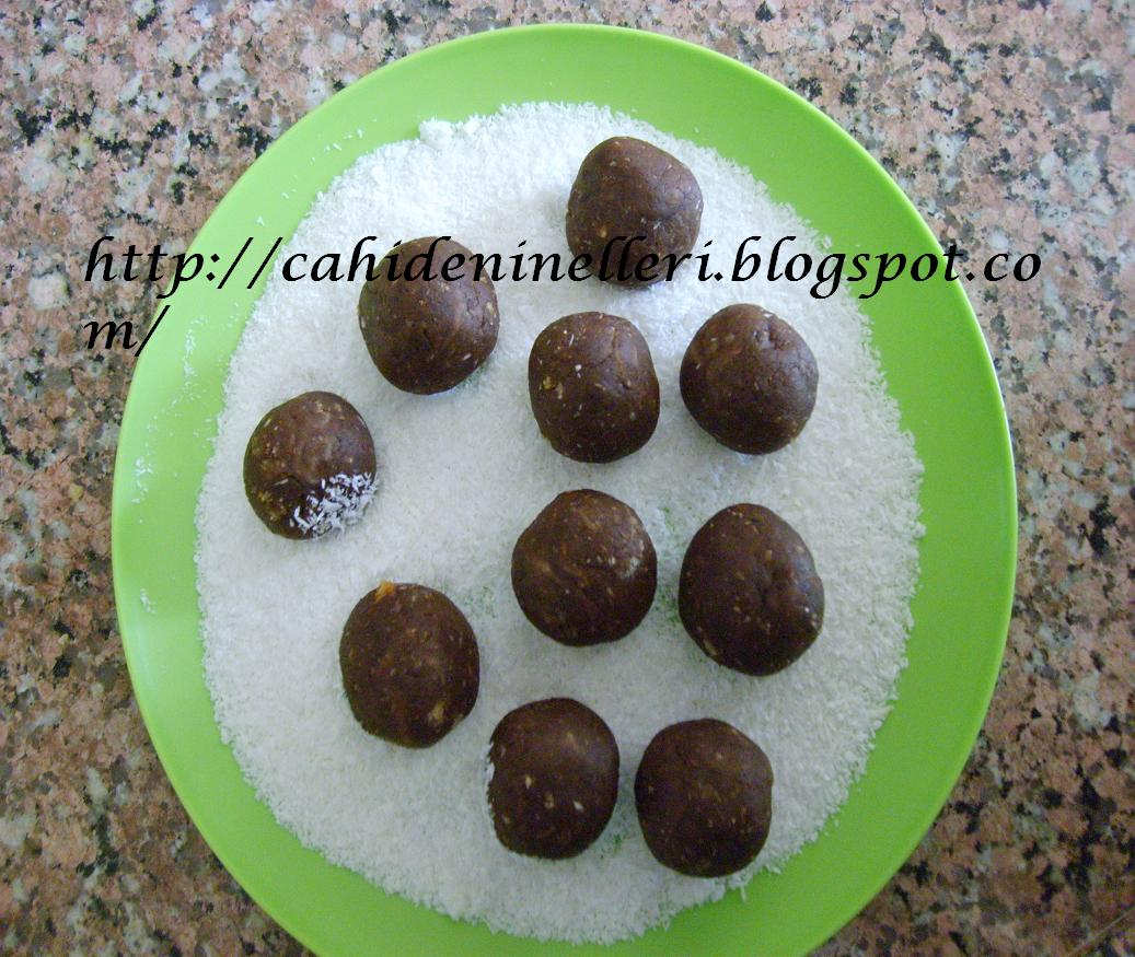 Aynı bisküvileri ufalar gibi ufaladım,üzerine 1su bardağı süt,2 yemek kaşığı kakao,2 y.kaşığı şeker,biraz hindistan cevizi kattım ve yoğurdum.siz isterseniz,damla çikolata,kuru üzüm cevizde koyabilirsiniz.