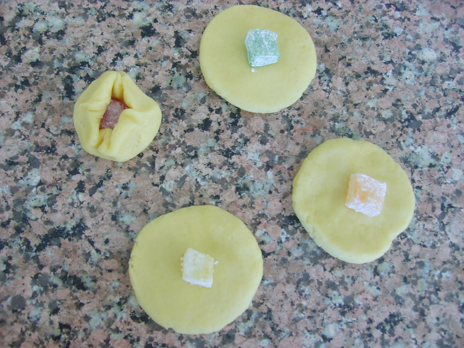 Her zaman yaptığınız gibi un hariç bütün malzemeleri karıştırın.Unu azar azar yumuşak bir hamur elde edene kadar ilave edin.hamurdan ceviz büyüklüğünde parçalar alıp tezgahın üzerinde çay bardağı büyüklüğünde açın içine bir tane lokum koyun kapatın.Önceden175 derecede  ısıtılmış fırına sürün.renkleri çok kızarmadan çıkarın sıcakken üzerine bolca pudra şekeri serpin afiyet olsun.