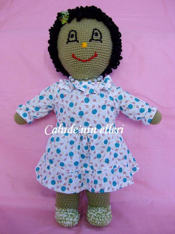 Uzun zamandır elişlerimden yayınlayamadım.Fakat zenci bebeğimde epey zamandır sırada bekliyordu.Onu çok sevdik.Tıpkı zenci bebekler gibi bu da çok sevimli.Artan iplerimi değerlendirdim yine.Elbisesini de kendim diktim.Yine tepeden başlayıp aşağı doğru devam ettim.biraz uğraştırsa da emeğime değdi doğrusu …