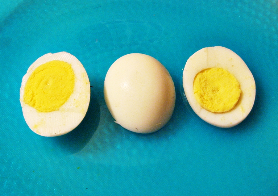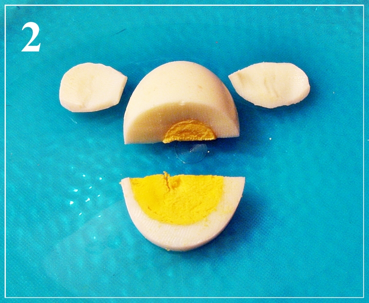 Yarım yumurtayı yatay olarak 2’ye kesin. 1. yarımı, kafa kısmı olarak kullanın. 2.yarımı da ortadan dilimleyin, büyük parçayı ağız kısmı olarak kullanın. Küçük parçanın içersinde kalan sarısını çıkartıp beyazından kulak şekli kesin, elde ettiğiniz kalın kulağı ortasından yatay olarak dilimleyerek 2 kulak elde edin. Son olarak, 1.resimde, ortadaki parçayı yatay olarak ağız ve kafa kısmının üzerine koyarak burun elde edin.
