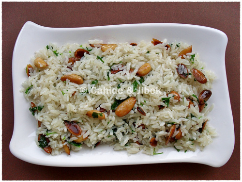 Cahide’nin notu:Eğer bademleri pilav pişerken koyarsanız,bademler yumuşar.Bu yüzden en son katılmalıdır.