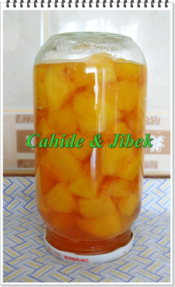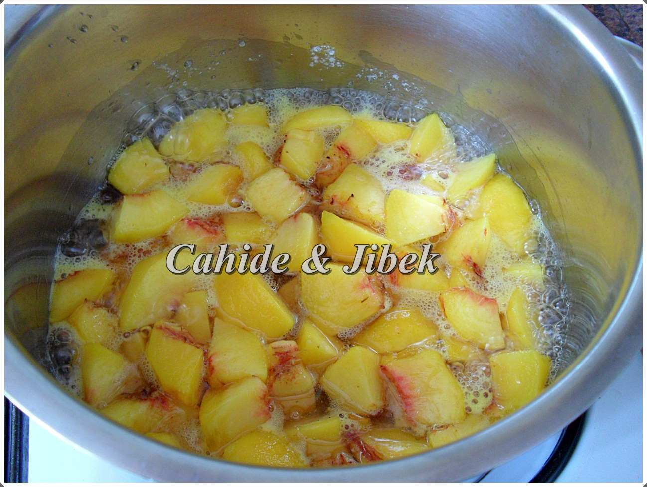 Tencereye 1 bir su bardağı şeker ve bir su bardağı su koydum.10 dakika kadar kaynattım.5-6 adet iri şeftaliyi soyup doğradım.Bu şurubun içine attım.15 dakika kadar da bu şekilde kaynattım.Üzerine gelen köpüğü aldım.Aynı şekilde sıcakken kavanoza koyup ters çevirdim.