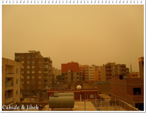 Bu görüntü 2 gün önce şehrin üzerine çöken toz bulutudur.Dehşet veren bir manzaraydı. Böyle bir görüntüden sonra yağan yağmurun ortaya nasıl bir sonuç çıkaracağını tahmin edersiniz. Balkon, camlar, yollar her yer çamur içindeydi. Hele o yağan yağmurun altında yürümek zorunda kalırsanız vay geldi halinize 🙂