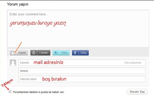 Her yazının altında bulunan yorum kısmına tıklayın. Açılan yorum penceresinin alt kısmında GUEST yazan kısmı seçin. Görünen boşlukları resimde görüldüğü gibi, en üste mail adresiniz, orta kısma isminiz olacak şekilde doldurun. Bir siteniz yoksa alt kısmı boş bırakın. Yorumlarımın takibini e-posta ile haber ver kısmını işaretlerseniz, sizden sonra yapılan yorumlar mail kutunuza gelir. Son olarak Yorum Yaz kısmına tıklayıp, yorumunuzu gönderin.