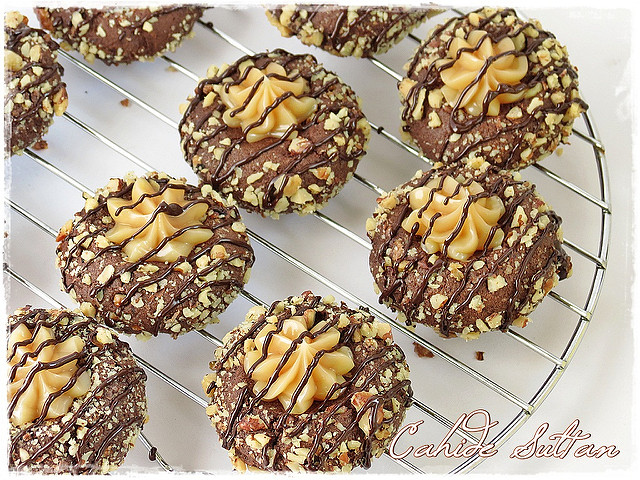 süt reçelsiz yaptım kurabiyeyi ama fındıkları döküldü.bastırdım da niye öyle oldu cahideciğim?göbek boşluğuna da bonibon koydum.diğerlerine de erimiş çikolata döktüm.bazılarını hindistan cevizine buladım hindistan cevizleri kızardı.