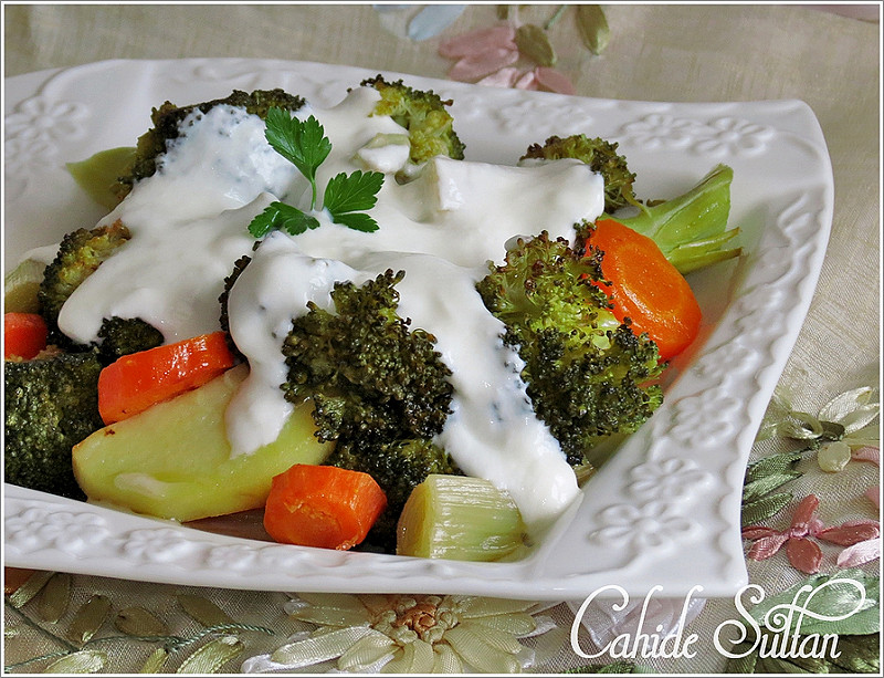 - Fırından aldığınız sebzeleri servis tabağına alıp, hafif ılıyınca üzerine sarımsaklı yoğurdu gezdirin.
