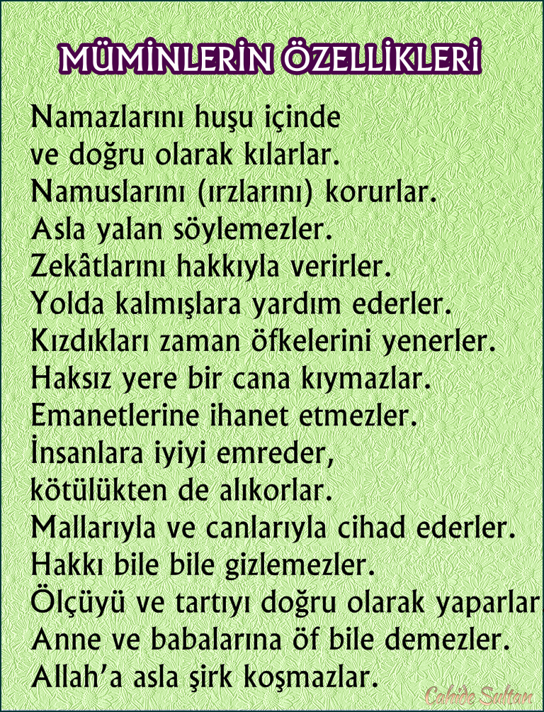 Gerçekten müminler kurtuluşa ermiştir. Onlar ki, namazlarında huşû içindedirler, Onlar ki, boş ve yararsız şeylerden yüz çevirirler, Onlar ki, zekat (vazifelerini) yerine getirirler,Ve onlar ki, iffetlerini korurlar, Ancak eşleri ve ellerinin sahip olduğu hariç. (Bunlarla ilişkilerinden dolayı) kınanmış değillerdir. Şu halde, kim bunun ötesine gitmeyi isterse, işte bunlar , haddi aşan kimselerdir. Yine onlar ki, emanetlerine ve ahidlerine riayet ederler,Ve onlar ki, namazlarını muhafaza ederler,İşte asıl onlar varislerdir. Ki, Firdevs’e varis olan bu kimseler orada ebedî kalırlar. (Mu’minun suresi ilk 10 ayet)