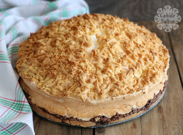 Kek ilk fırından çıktığında bu kadar yüksek oluyor ama sonra hafifçe iniyor. Soğuyunca mereng kısmı sertleşiyor ve rahatça dilimleniyor. Sertleşiyor dediysem, hazır satılan merengler gibi değil. Kesilebilecek düzeyde bir sertlik.