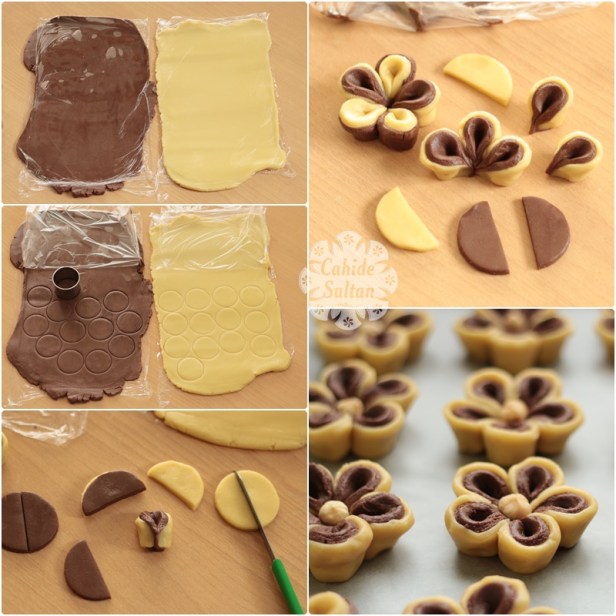 - Her iki hamuru orta boy yuvarlak kalıpla keserek yuvarlak parçalar elde edin. Her yuvarlağı bıçakla ortadan ikiye kesin. Bir kakaolu bir sade yarım daireyi üst üste koyun ve iki ucu birleştirerek yapraklardan birini oluşturun. Diğer hamurlara da aynı işlemi uygulayın. 1 çiçek 5 yapraktan oluşacak. Katlama işlemlerini streç film yardımıyla yaparsanız hamurda kırılma olmaz.