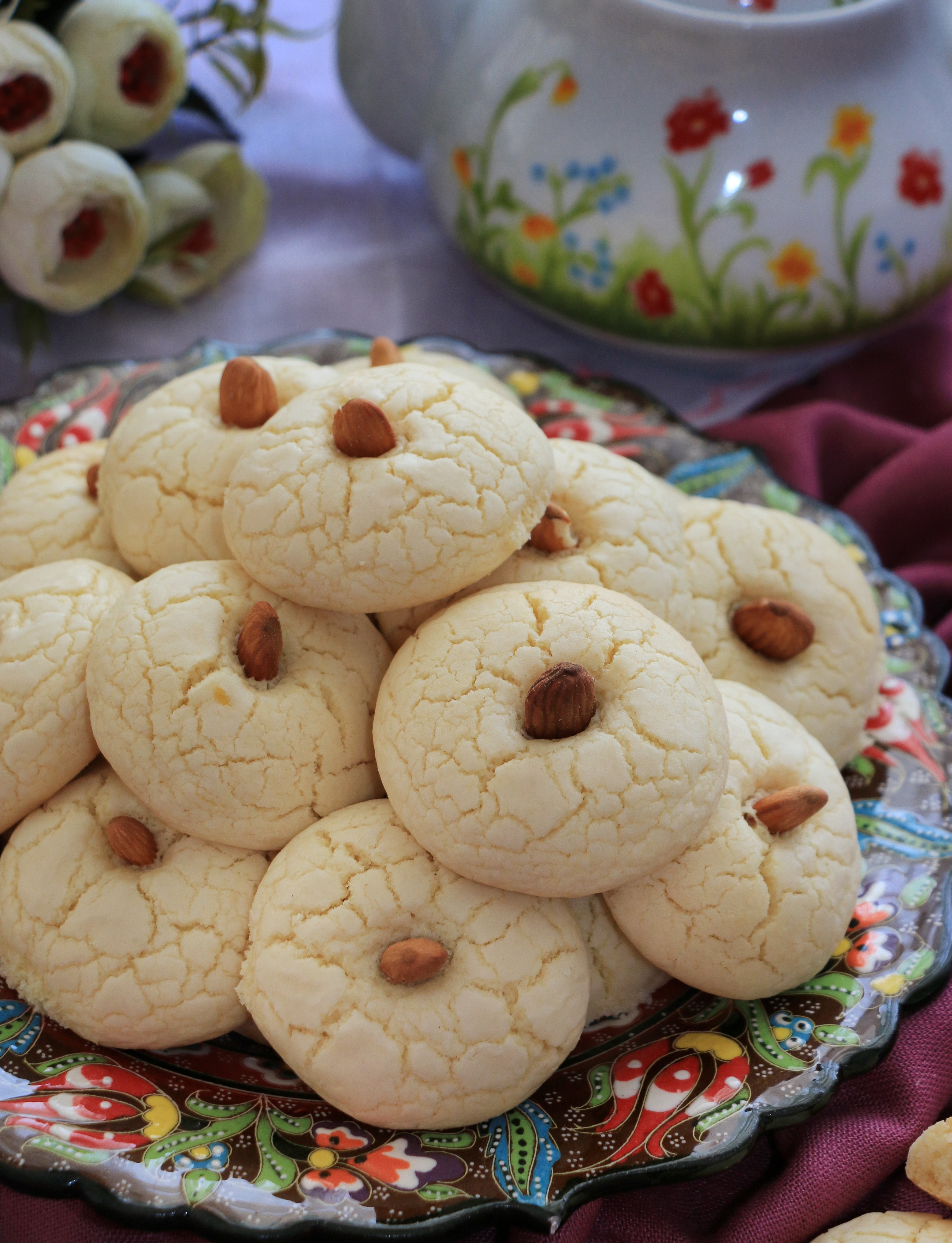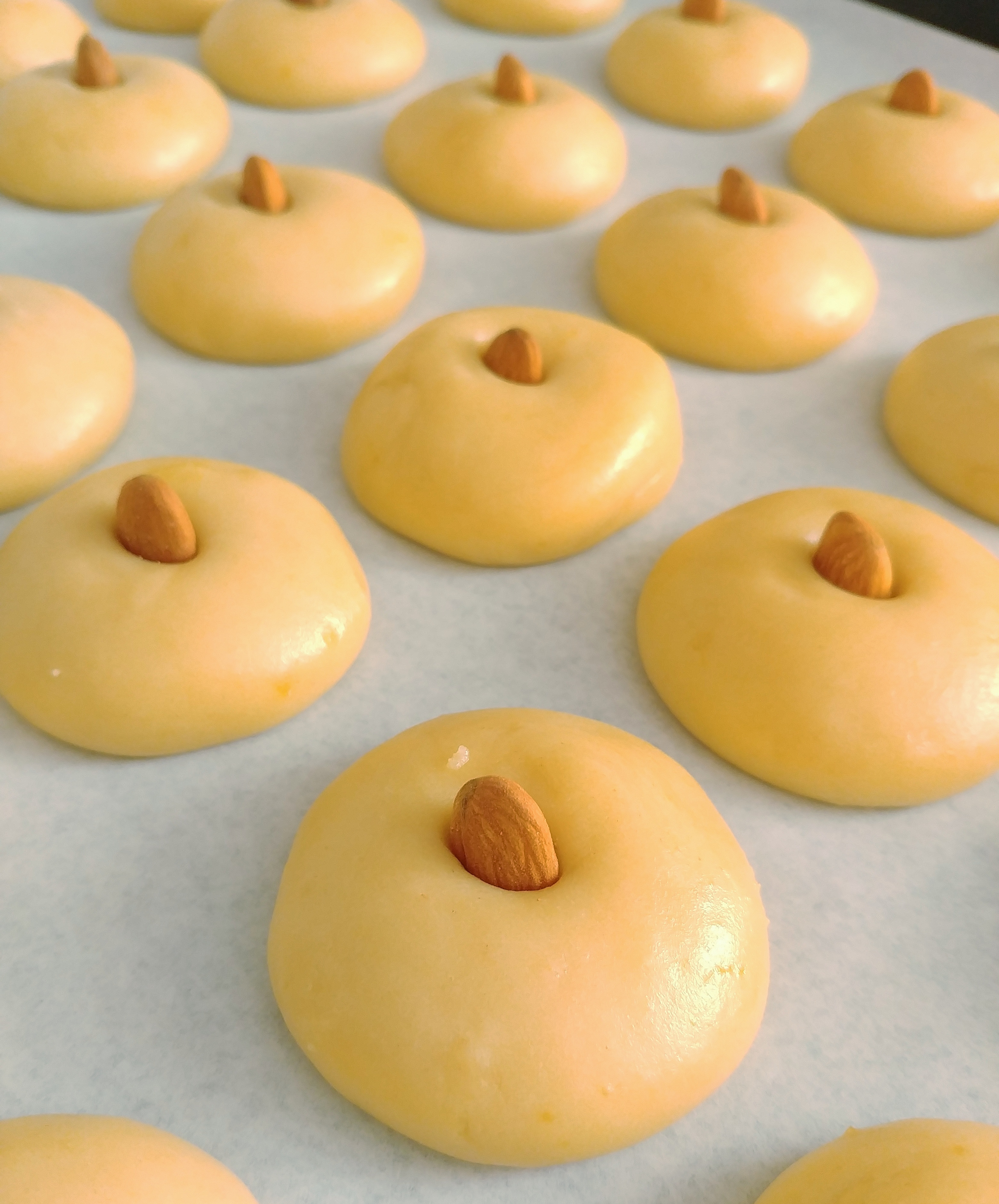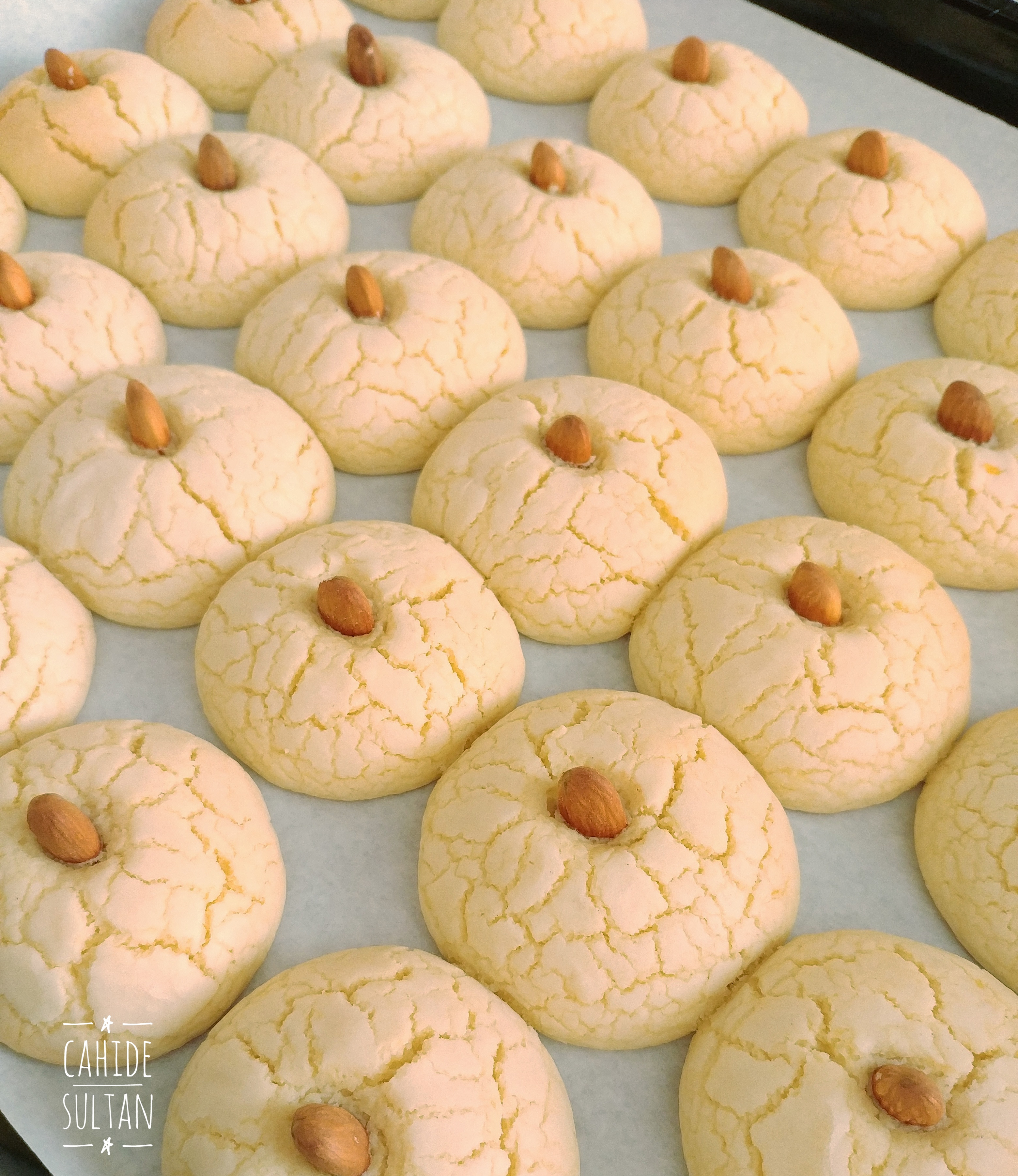 Hamurdan ceviz büyüklüğünde parçalar alıp yuvarlayın. Aralıklı olarak yağlı kağıt serilmiş tepsiye dizin. Üzerlerine badem batırın.