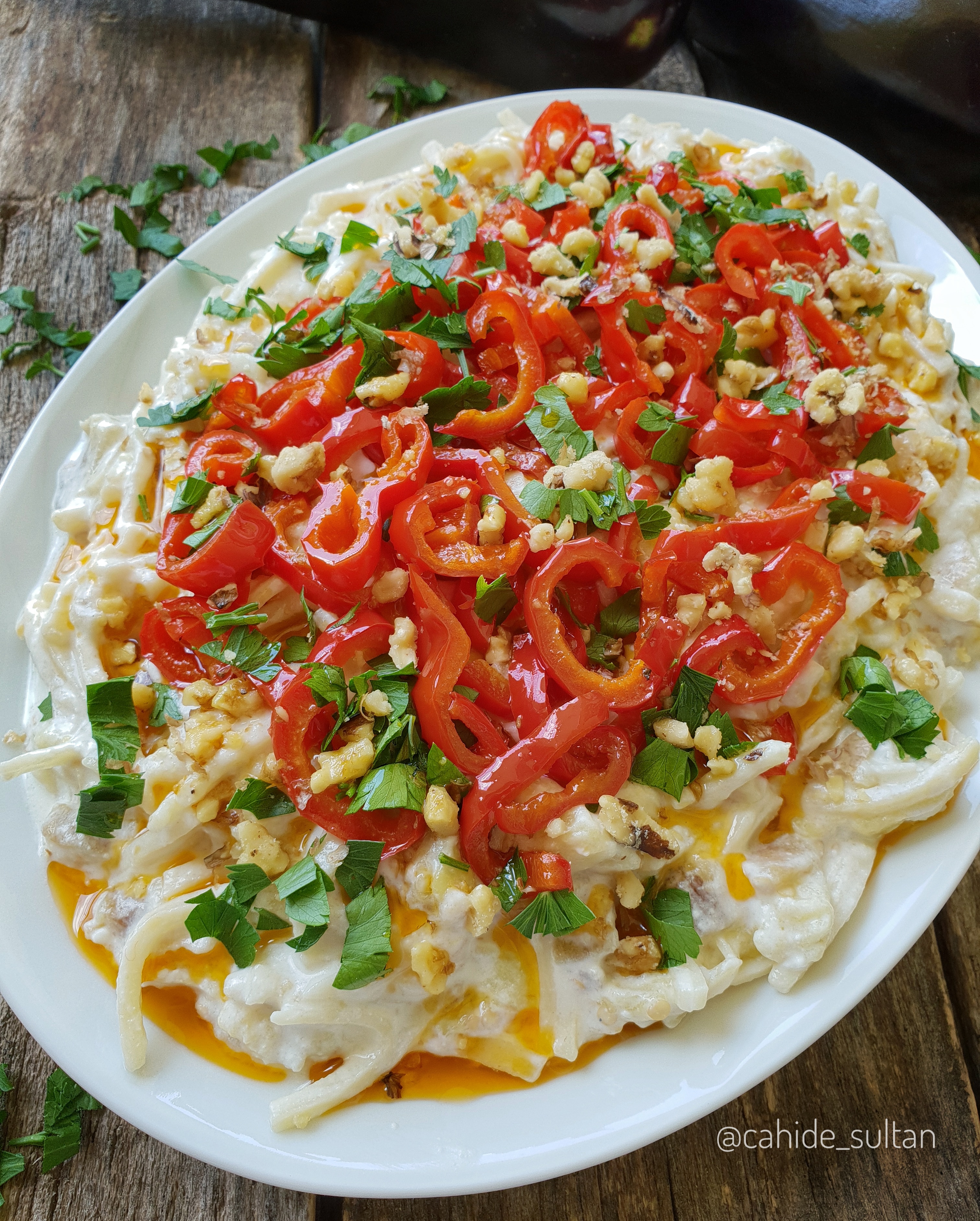 Erişteyi bol suyla haşlayıp süzün közlenmiş patlıcanları küçük küçük doğrayıp erişteye ilave edin üzerine Sarımsaklı yoğurdu ekleyip karıştırın. Bir servis tabağına döküp yayın. Diğer tarafta tavaya zeytinyağını ve ince uzun doğranmış kapya biberi ekleyip soteleyin.
