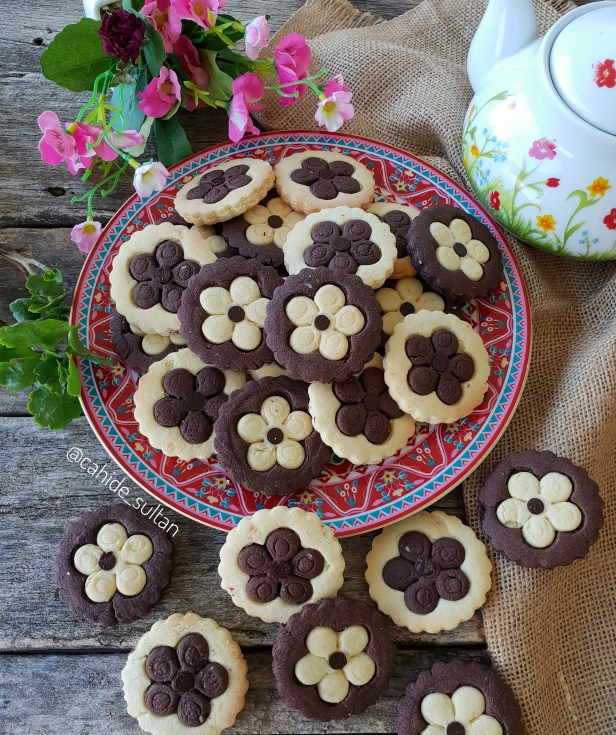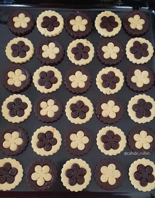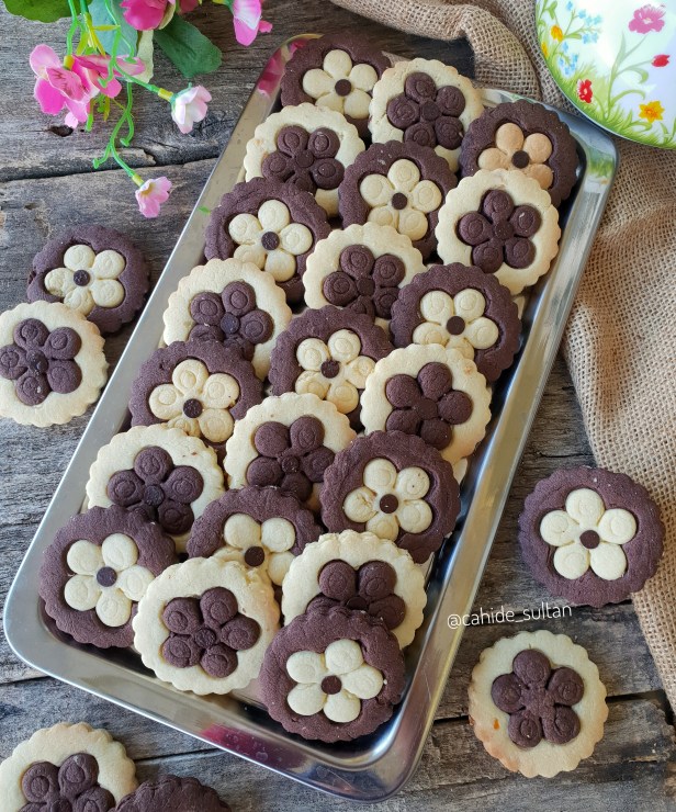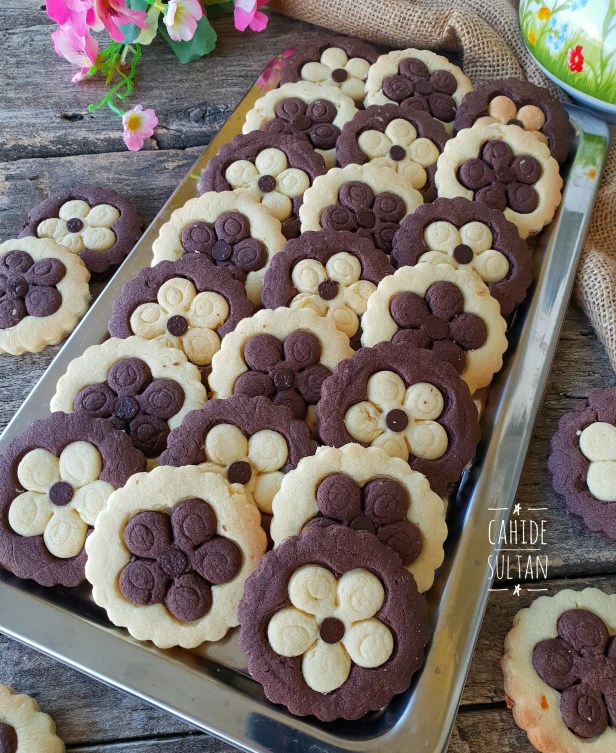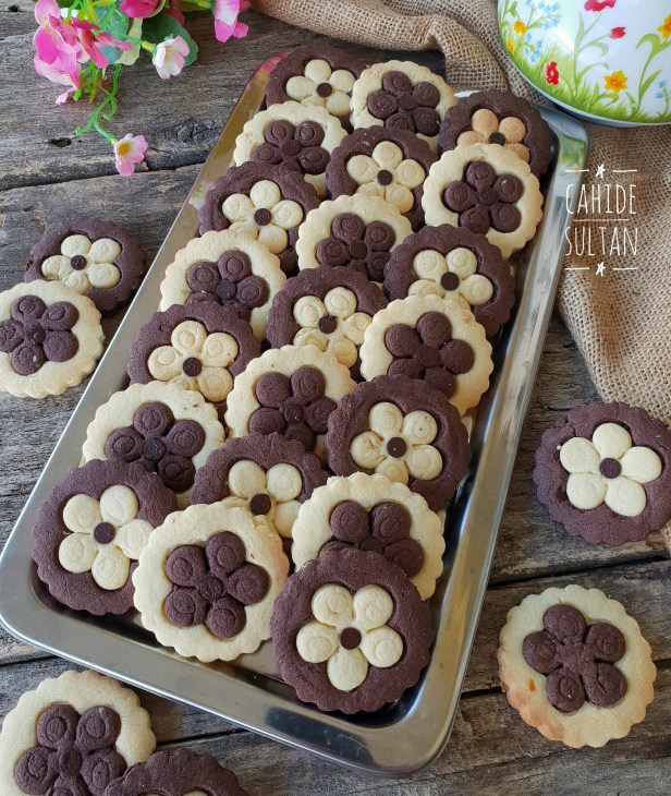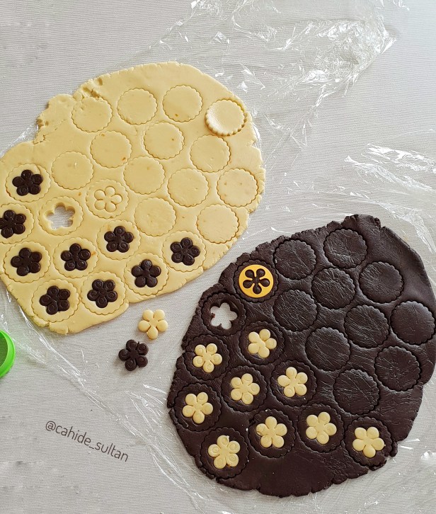 Hamur gevrek olduğu için, hamuru mutlaka streç filmin arasında 6-7 mm kalınlığında açın. Çiçek kalıpla, ayrı ayrı açtığınız sade ve kakaolu hamuru kesin.