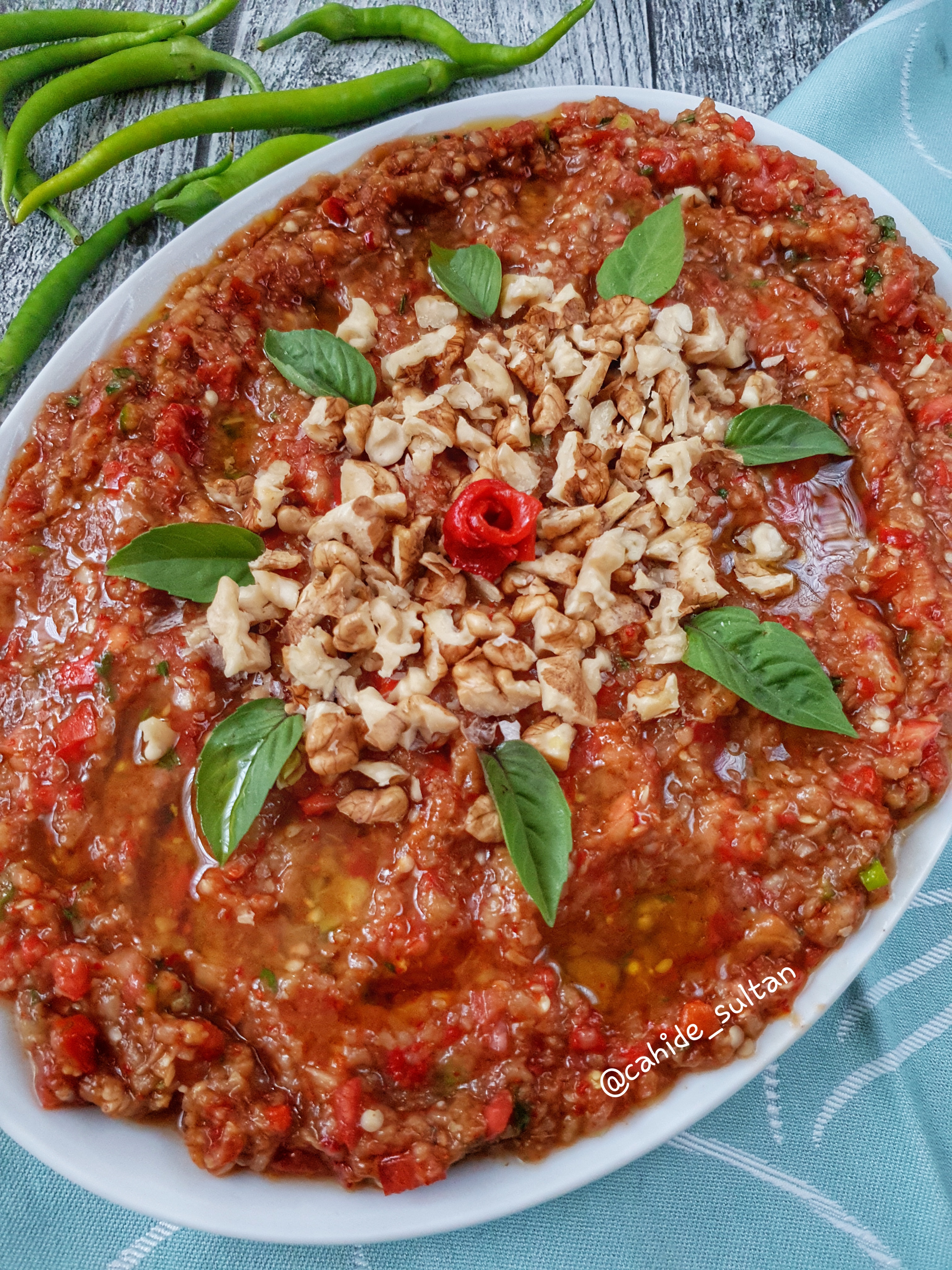 Patlıcan ve kırmızı biberleri közleyin temizledikten sonra bıçaklı vura vura kıyın.