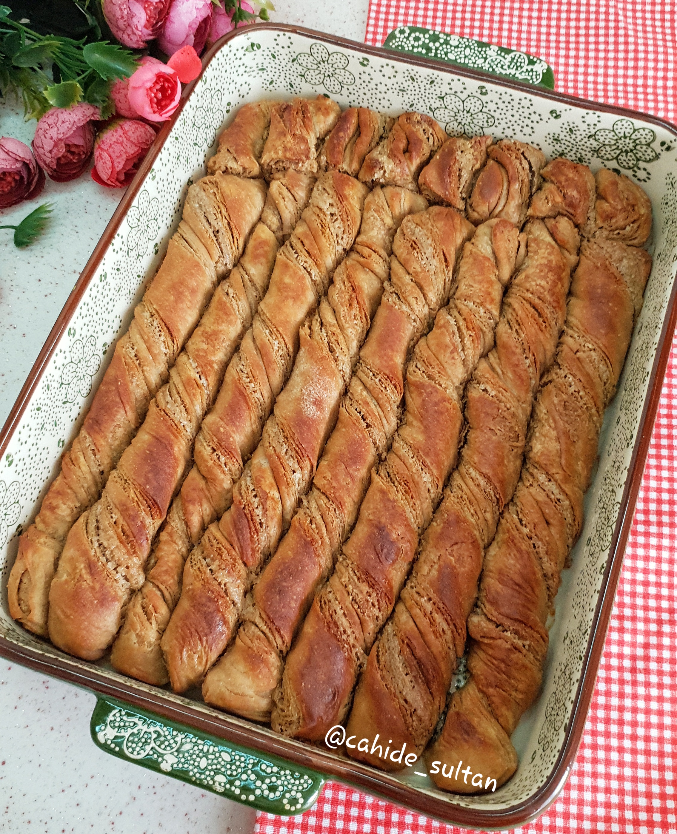 Iki parmak genişliğinde şeritler kesip her şehirde bükerek yağlanmış tepsiye hafif aralıklı olarak yerleştirin. Üzerini örtüp 1 saat kadar mayalandırın. 180 derecelik fırında üzeri kızarana kadar pişirin. Üzerine yumurta yoğurt gibi bir şey sürmüyoruz.