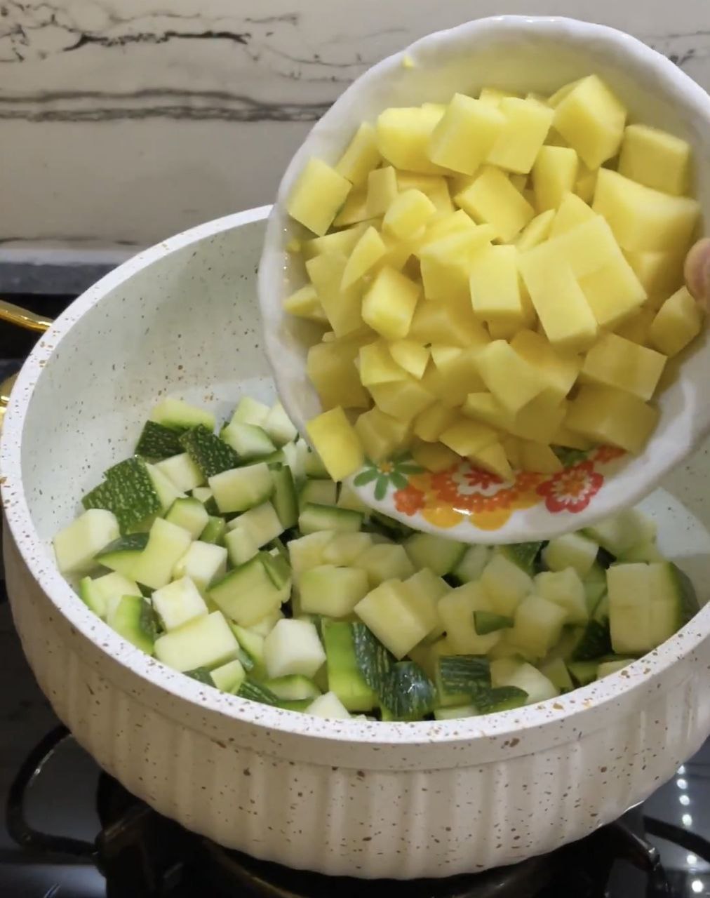Kabak, patates ve sarımsağı irice doğrayıp tencereye alın. Üzerine tavuk suyu ekleyip pişmeye bırakın. Su az gelirse biraz daha ilave edin.