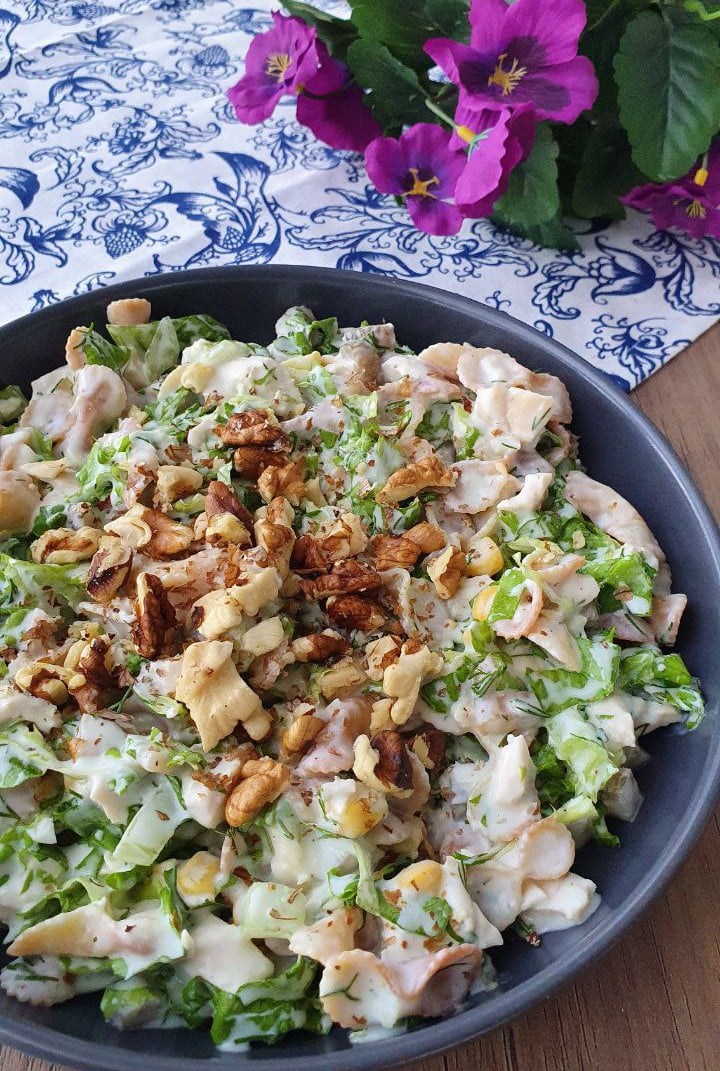 Tavuğu suda haşlayın (içerisine küçük bir soğan koymayı unutmayın). Haşlanan tavuğu çok büyük olmayacak şekilde küpler halinde doğrayın ve bir kaba alın. Makarnayı tavaya alıp az yağda rengi değişene kadar kavurun. Kavuran makarnanın üzerine 1 su bardağı kadar kaynar su ekleyin ve kapağını kapatın. Ara ara kontrol ederek suyunu çekip, yumuşayana kadar pişirin. Pişen makarnayı soğumaya bırakın. Geriye kalan malzemeleri çok küçük olmayacak şekilde doğrayın. Bir kapta tüm malzemeleri birleştirin. İçerisine dilerseniz ceviz koyup lezzetini artırabilirsiniz.